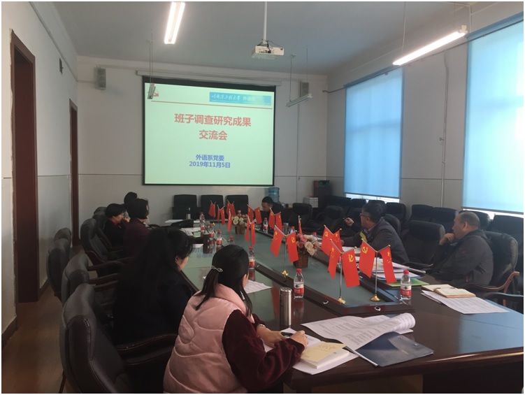 按照公司“不忘初心、牢记使命”主题教育集中学习计划安排,外语系党委于11月5日在41#417,组织召开了调查研究成果交流会。会议由分党委书记赵欣主持,班子成员全体参加,系党委委员杨剑、范莹芳、李丽、由春桥列席会议,校主题教育巡回指导组组长赵镇参会指导。