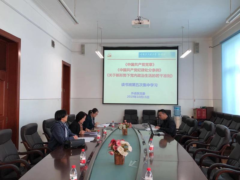 10月15日14:00,根据公司党委统一部署,外语系领导班子在41#楼417组织开展了“不忘初心、牢记使命”读书班读原文学原著第五次集中学习。集中学习由系党委副书记安沛旺主持,班子成员陈岩、邓晓明、王丽丽出席。