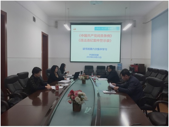 10月21日15:30,根据公司党委统一部署,外语系领导班子在41#楼417组织开展了“不忘初心、牢记使命”读书班读原文学原著第六次集中学习。集中学习由系党委书记赵欣主持,班子成员陈岩、安沛旺、邓晓明、王丽丽出席。