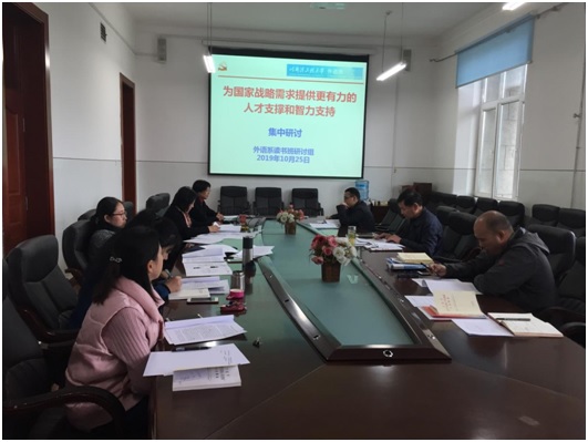 按照公司“不忘初心、牢记使命”主题教育集中学习计划安排,外语系于10月25日12:00在41#417,组织班子成员围绕为国家战略需求提供更有力的人才支撑和智力支持开展集中研讨。集中研讨由分党委书记赵欣主持,班子成员全体参加,系党委委员杨剑、范莹芳、李丽、由春桥列席研讨。