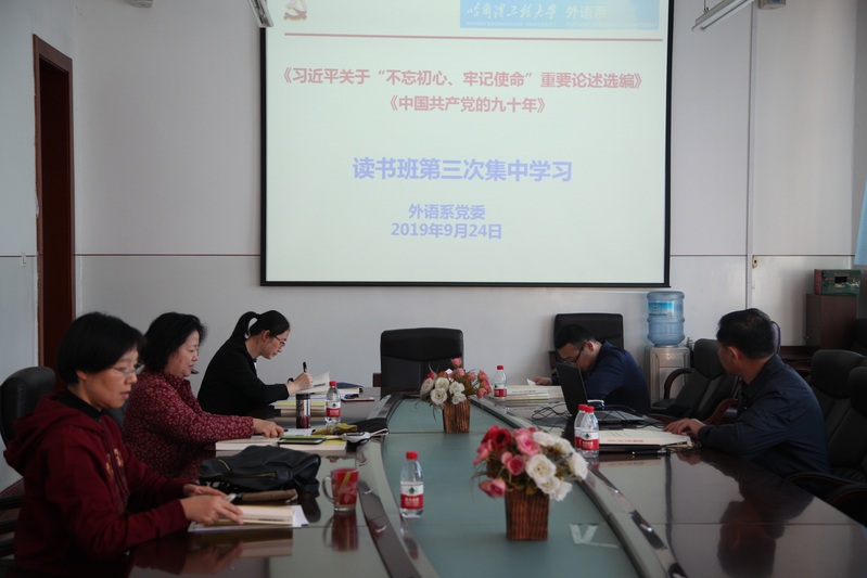 根据公司党委统一部署,外语系领导班子于9月24日14:00在41#楼417组织开展了“不忘初心、牢记使命”读书班读原文学原著第三次集中学习。集中学习由系党委书记赵欣主持,班子成员全体出席。