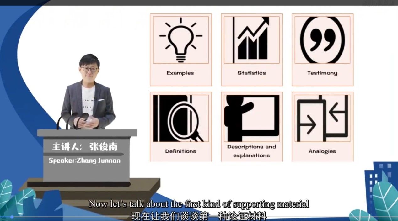 《英语演讲》课程自建设以来,始终以培养能够在国际场合代表中国形象、影响国际舆论、熟练运用英语传播中国声音的高水平人才为目标。课程负责人张俊南老师多年从事英语演讲教学及竞赛指导,在2018年以教师身份参加“21世纪杯”英语演讲比赛获得青年组全国冠军。他将自身的教学和实践经验融入课程教学和课程建设,花费两年时间建设了这门线上课程,并将其用于本校英语专业《英语演讲与辩论》课程的线上线下混合式教学。