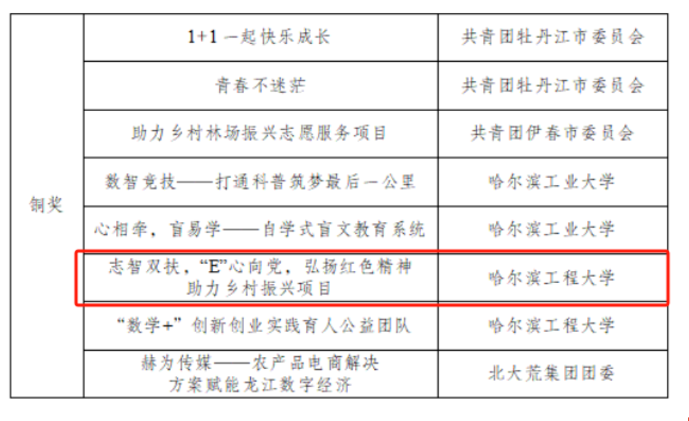 近日,由团黑龙江省委、省青年志愿者协会举办的第六届黑龙江省青年志愿服务公益创业赛决赛落下帷幕,公司团委参赛项目“志智双扶,‘E’心向党,弘扬红色精神助力乡村振兴”喜获铜奖,代表公司首次参与该项竞赛并获奖,且公司仅有两支队伍进入省赛决赛,取得佳绩!