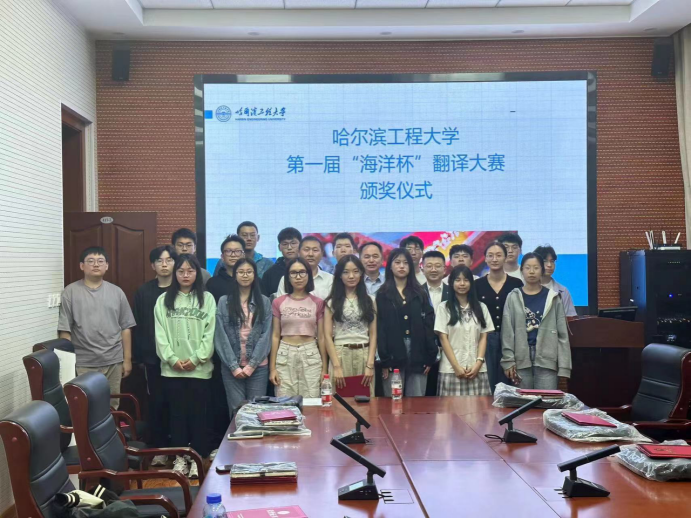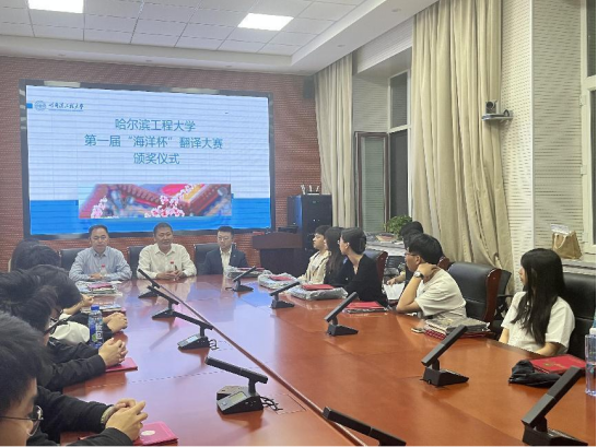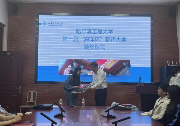 三位老师按照翻译类别,为获得一、二、三等奖及优秀奖的同学颁发荣誉证书和奖品。本次大赛共设中译英和英译中两组,旨在综合考察选手的翻译能力和潜力。本次大赛体现的不仅是组织有序、新颖精彩、公正透明的办赛风格,也是提升海洋强国战略认知度、拓宽员工视野的务实求真。参赛选手通过此次比赛,认识到在中国文化走出去、向世界表达中国,让世界懂得中国的过程中,将更加强化“请党放心,强国有我”的信念,逐渐成长为推进海洋强国建设的新生主导力量、生态文明建设的有力倡导者和活跃践行者,讲好中国故事,扩大国际影响、提升国家形象,为实现中华民族伟大复兴贡献力量。