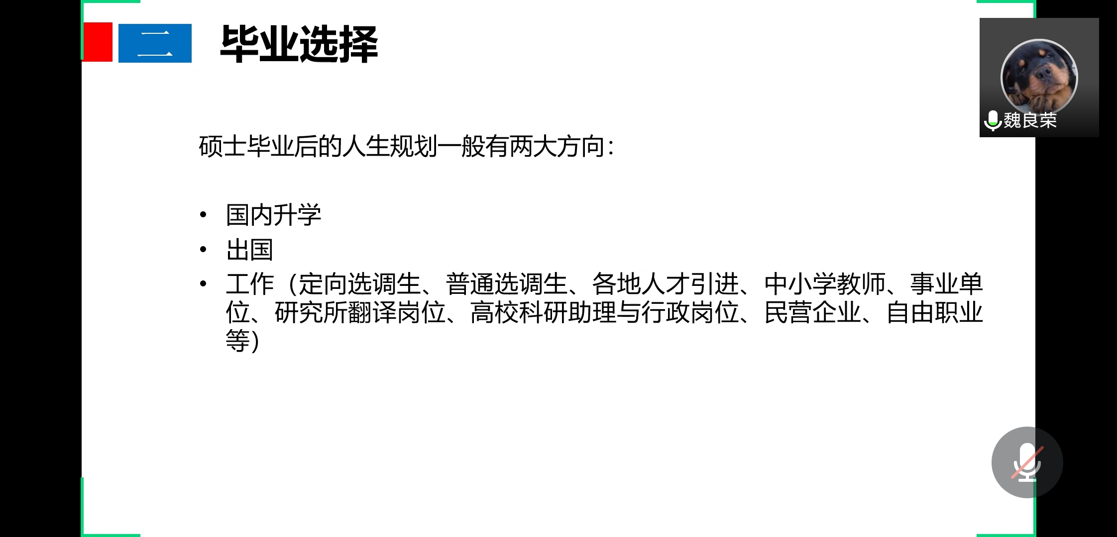 6月18日,外语系优秀研究生毕业生魏良荣以“研究生的就业选择”为题,于腾讯会议开展专题讲座,外语系研究生会主办,全体研究生参加。