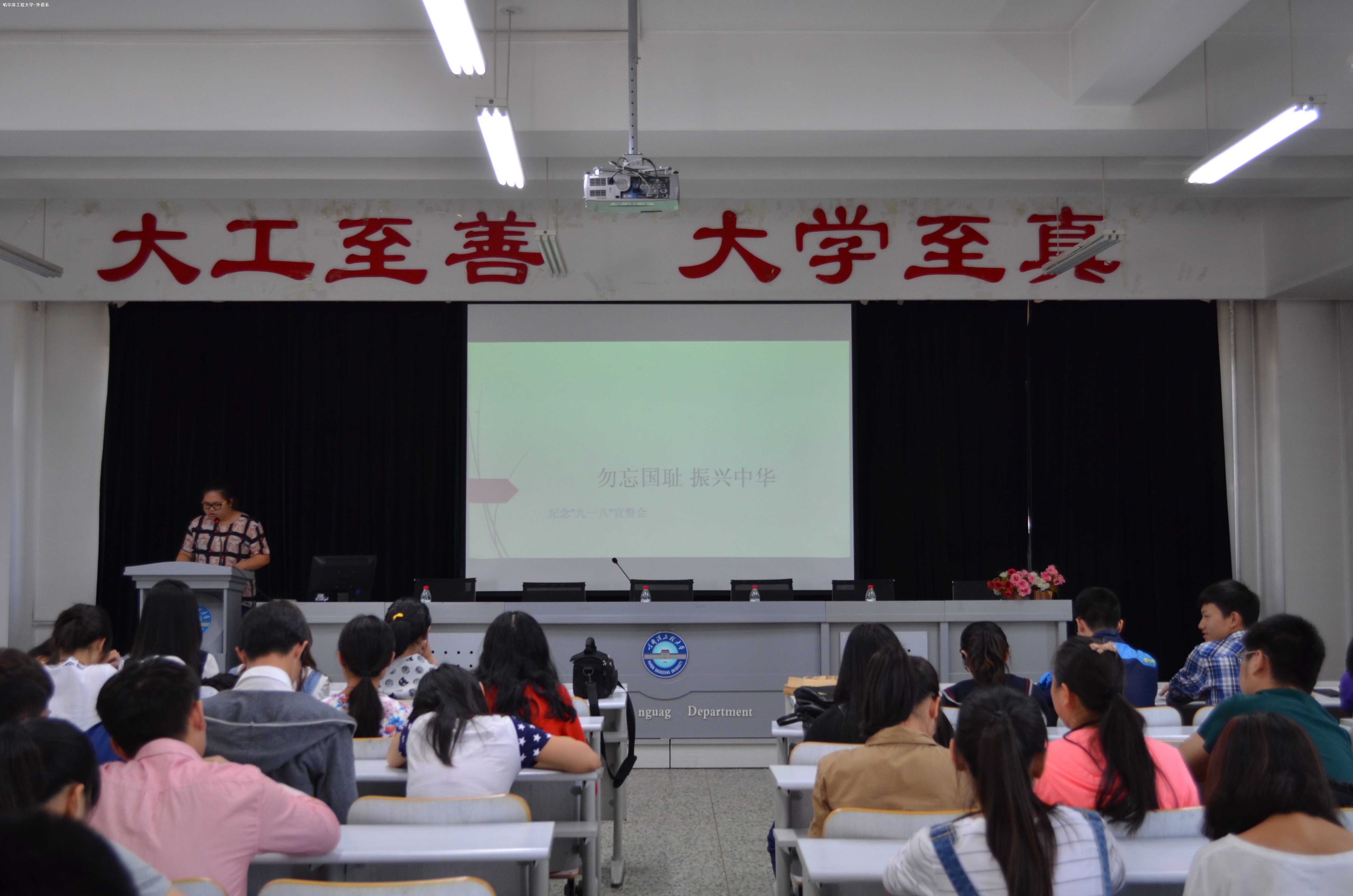 9月17日上午10点外语系团委组织部在基础楼501举行了以“勿忘国耻,振新中华”为主题的“九一八”宣誓活动,外语系团委,员工会全体干部和大一,大二全体同学参加此次活动。