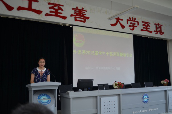 2015年6月15日中午12.40,外语系新一届团委副书记赵鑫同学在基础楼501召开第一次2015届团委员工干部见面暨培训大会,外语系新一届团委员工会干部全部出席,团委书记由春桥发表讲话。