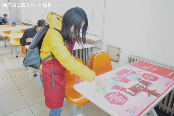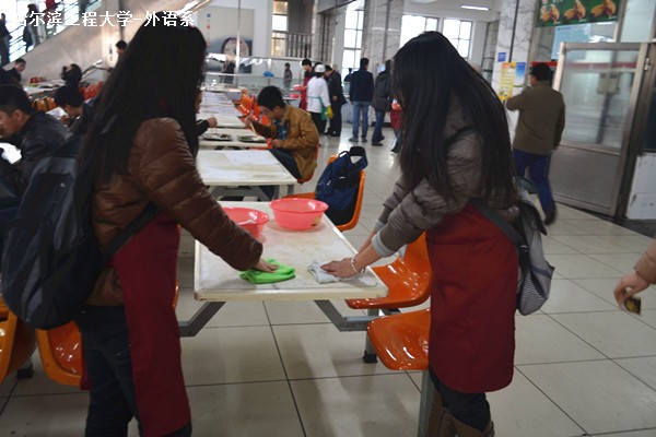 外语系辅导员由春桥和高明慧以身作则,同团委员工会成员们一同往返于各餐桌前,帮助食堂后勤人员清理餐桌,并且委婉地提醒就餐人员不要浪费粮食,尽量保持餐桌洁净,不随意乱丢垃圾,提醒同学们把垃圾带走,扔到垃圾桶里,养成良好的就餐习惯。看到同学们忙碌的身影,大家都渐渐开始自觉收拾好餐桌,主动把垃圾带走扔掉。