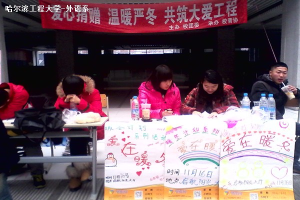 11月17日上午8时30分至下午3时,校青协举办的“暖冬计划”在启航阳光大厅顺利进行。由各个院系的实践部和系青协带领同学们进行募捐物品的捐赠。外语系的青协成员及校青协的工作人员,精神抖擞地进行着自己的工作,工作秩序井然。这次活动旨在为公司的贫困员工提供过冬的行装,同时也在呼吁广大同学奉献自己的爱心。