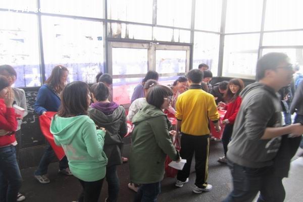 5月7日中午12点10分在老员工美食城门口,外语系20101212班团支部开展了以“携手人道、奉献爱心、关注贫困儿童”为口号的纪念第50届世界红十字日的团聚爱心活动。