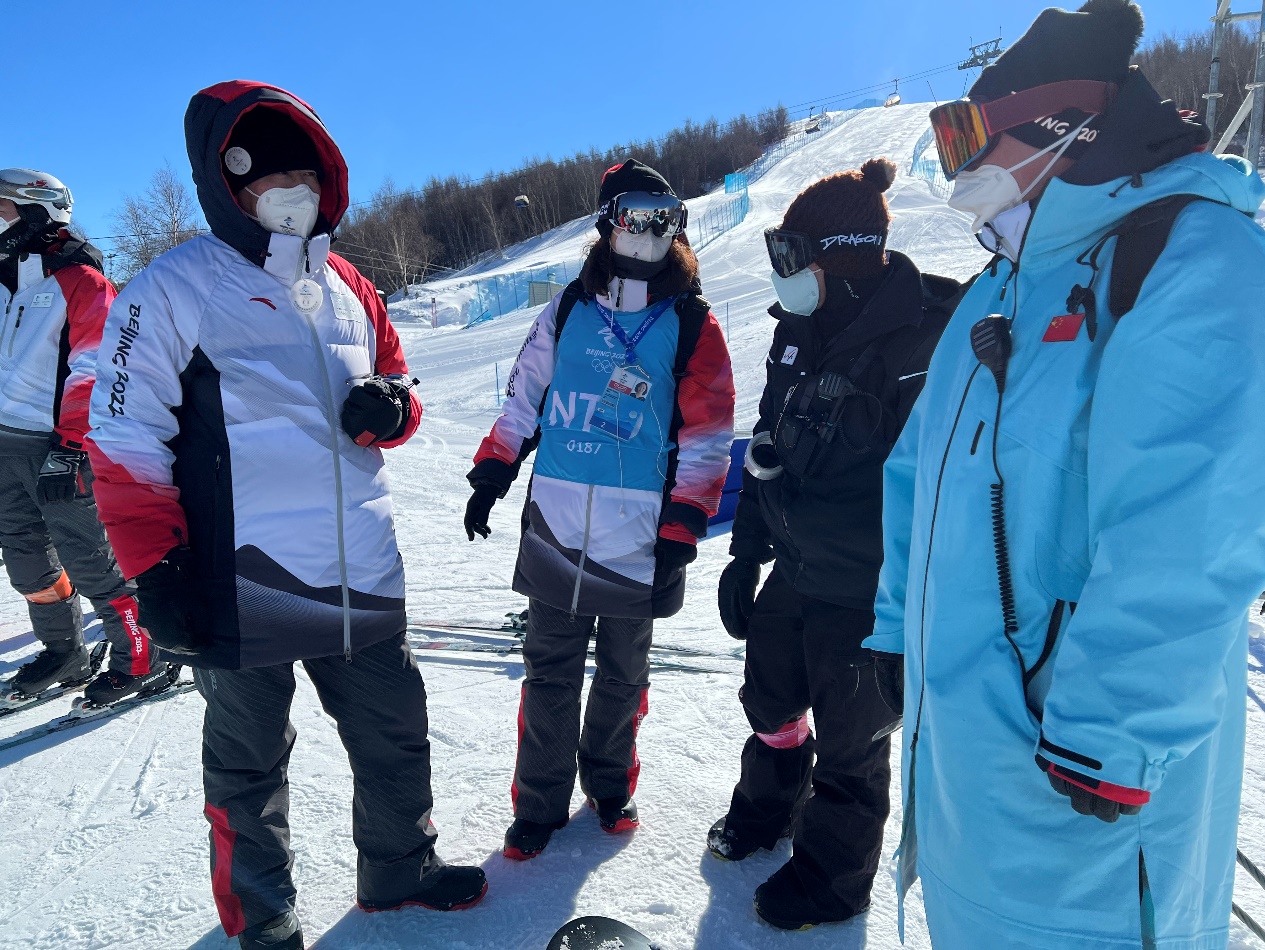 梁红(图中)在2022年北京冬奥会赛时与国际雪联技术代表沟通场地参数