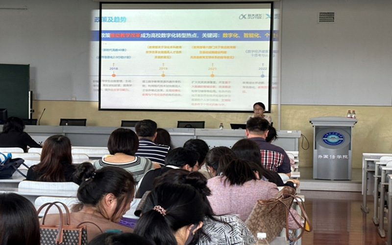 首先,副经理王丽丽介绍了当前国内外语改革及课程建设现状,教学技术经历并见证了慕课、微课、SPOC、翻转课堂等新兴教学技术和教学方法的变革,如今迎来了以数字化赋能教育高质量发展的阶段。ChatGPT的出现更是对教育提出了新的挑战,人工智能赋能外语教学的时代已经到来,培训是贯彻党的二十大报告提出的“推进教育数字化”的具体措施。