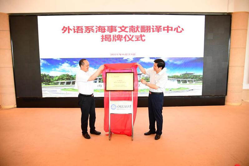 张信学与高晚欣共同为外语系海事文献中心揭牌。外语系海事文献翻译中心的成立,为培养具有船海核特色的高层次外语人才,引领外语学科专业向纵深发展起到积极促进作用。