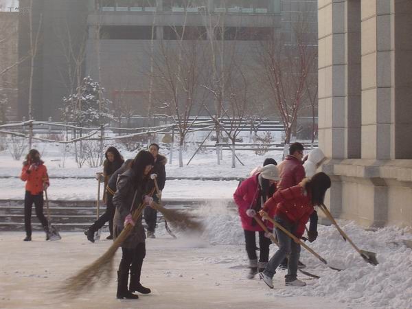 14日下午两点半,外语系组织本科生员工党员及10级新生对一号楼的南楼北楼之间区域的积雪进行了清扫。近日,哈市普降大雪,给同学们的日常出行带来了极大的不便。根据公司安排,各院系纷纷开展了积雪清扫工作。